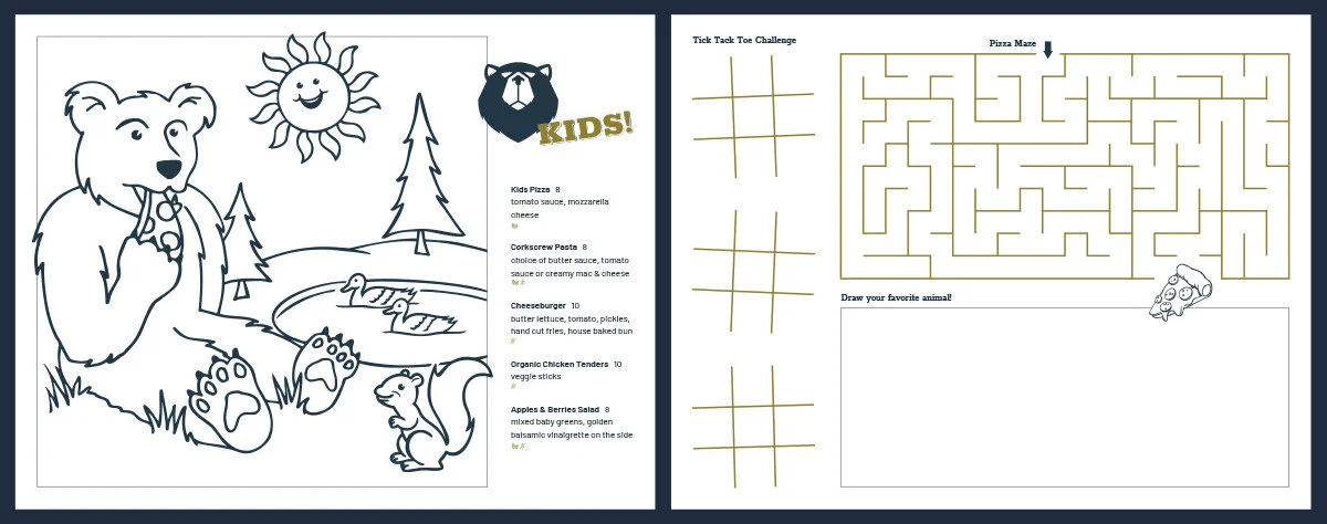 Menus (for food, beer, wine, kids, dessert, and seasonal items), gift cards, growlers, signage and other promotional materials keep the brand consistent.